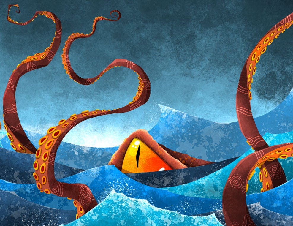 Last year, the mischievous troupe of my nephews, who are both funny and amazing, paid me a visit. We don't get to see each other often; they live in Italy, and I'm in England. It's not an insurmountable distance, but it's not always easy to meet as frequently as we'd like. You know how kids are—little bundles of volcanic energy, always bursting with incredible enthusiasm. So, one evening, to keep them occupied, I began recounting mythological stories that I knew would captivate their interest. However, I made a crucial mistake by mentioning one of my favourite creatures—the Kraken. ...they'd never heard of it. Instead of simply describing it to them, I decided to change the rules of the game and asked them to imagine and draw it themselves. That's when the doors to fantasy and imagination swung wide open!
